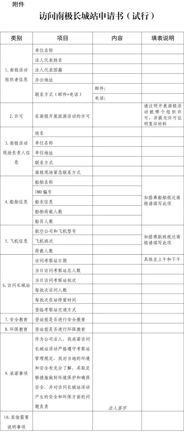 按照指南,擬申請赴長城站開展旅游的企業(yè),可以在每年9月15日至9月30日期間的工作日,向自然資源部政務大廳現場遞交中文版書面材料。
