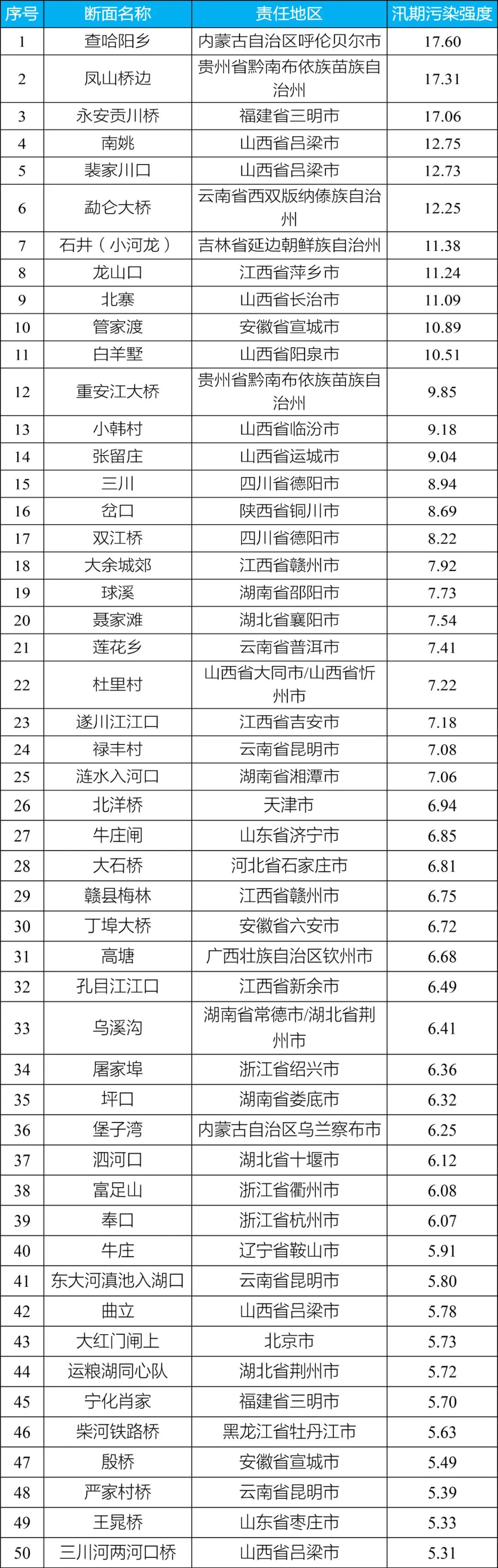 全國汛期污染強度較大的前50名斷面分布在20個省份(見附件3),數(shù)量較多省份為山西(9個)、江西(5個)、云南(5個)。其中,內(nèi)蒙古自治區(qū)呼倫貝爾市查哈陽鄉(xiāng)斷面、貴州省黔南布依族苗族自治州鳳山橋邊斷面、福建省三明市永安貢川橋斷面汛期污染強度位于全國前三名,分別達到考核目標限值的17.6倍、17.3倍、17.1倍。