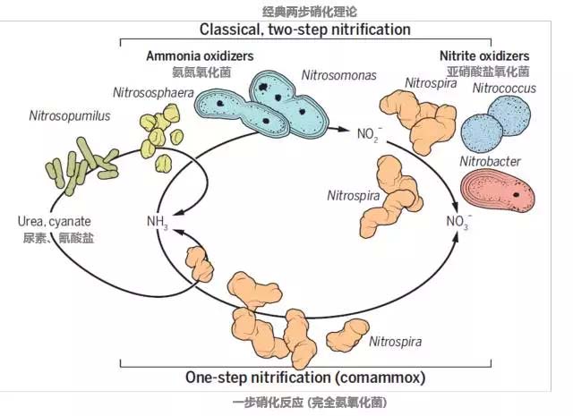 這個理論最先是由俄國微生物界傳奇維諾格拉斯基 (Sergei Winogradsky)早在19世紀末“成功”展示,他分離出了負責這兩步硝化的微生物,也就是所謂的AOB(ammonia oxidizing bacteria)和NOB(nitrite oxidizing bacteria)。但這個超過100年歷史的教條在2015年圣誕節(jié)前被英國明星科學雜志《自然》上的兩篇同日發(fā)表的題目雷同的文章和隨后一篇在美國微生物學會的文章終結(jié)了。三個科學團隊發(fā)現(xiàn)了三種不同的培養(yǎng)[1,2]和一種非培養(yǎng)細菌[3]能夠各自進行從氨氮到硝態(tài)氮的完全硝化過程。